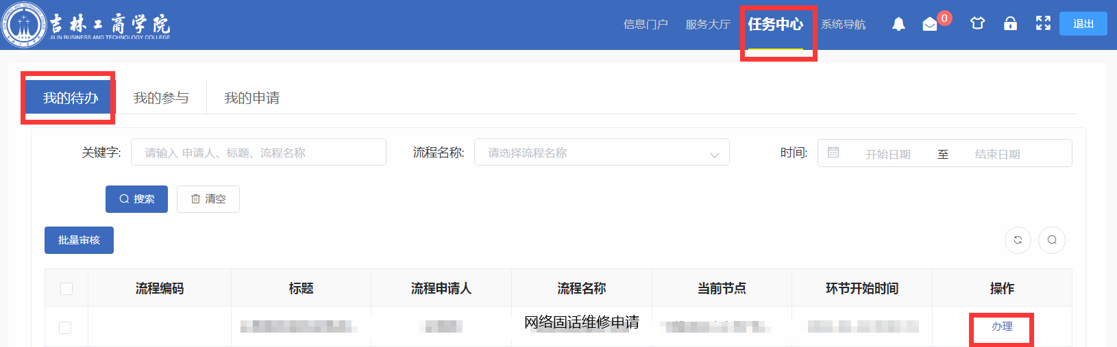 第五步:申请结束后可在“任务中心”→“我的申请”中查看申请状态。到此“网络固话维修申请”申请流程结束等待审批人审核即可。